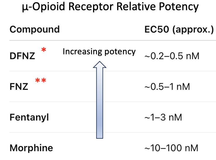 DFNZ targets the same target as morphine and fentanyl – the µ-opioid receptor. In laboratory tests, it behaves as a “superagonist,” meaning it can activate the receptor even more strongly than standard opioids (Table 1).